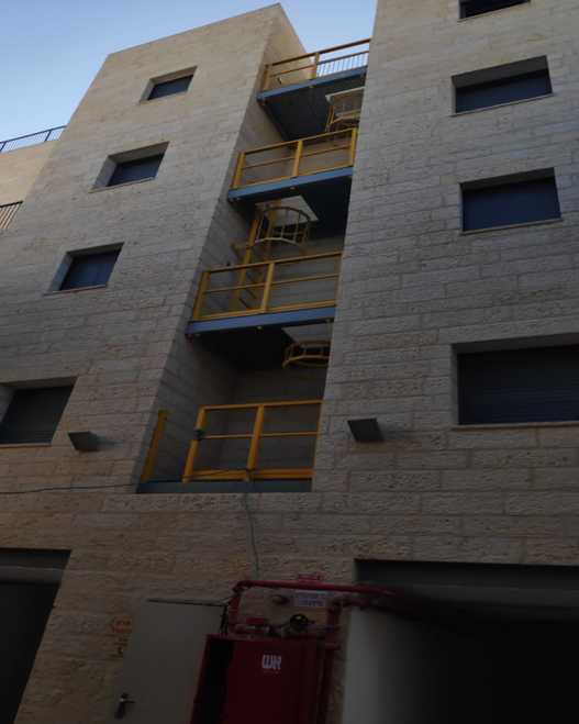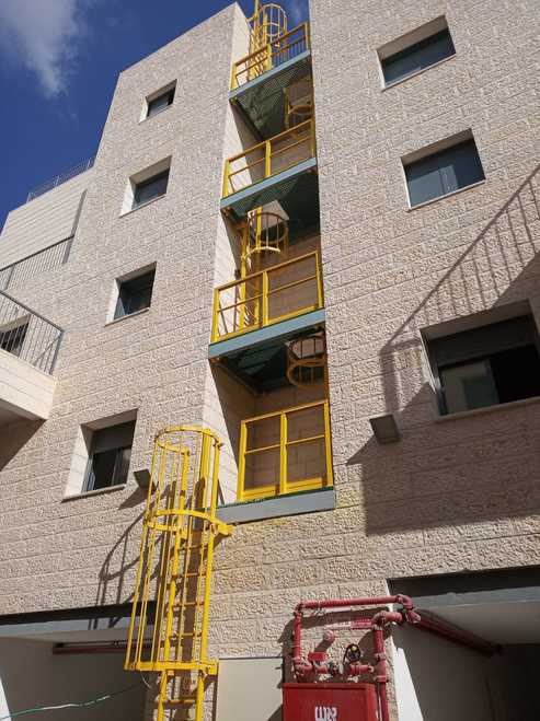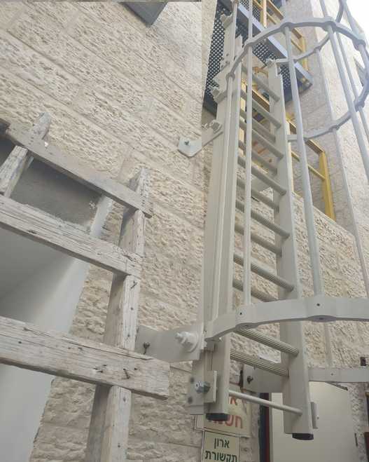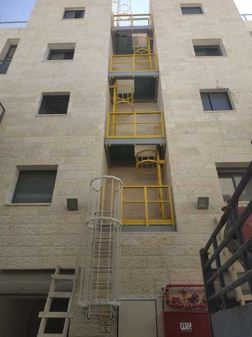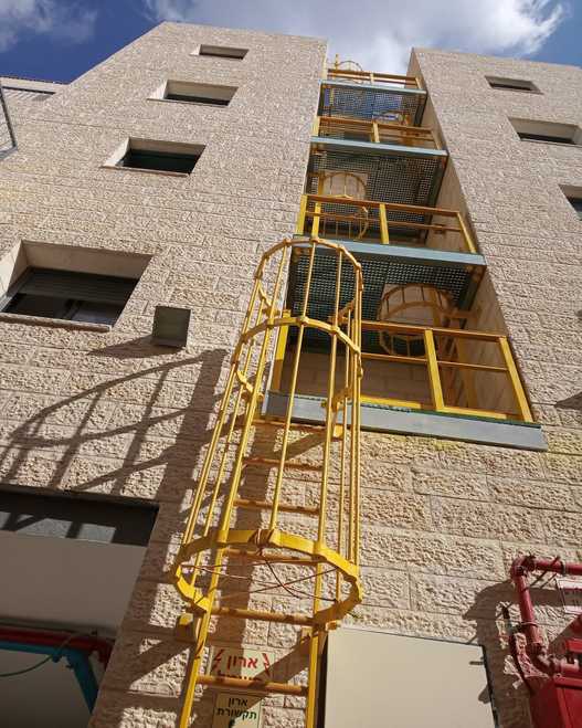 בניית מערכת נגישות חירום ובטיחות בבית ספר שממקום בבית שמש. סולם עם פרודסט מנוחה הכולל מעקה וכלוב הגנה מפני נפילה.